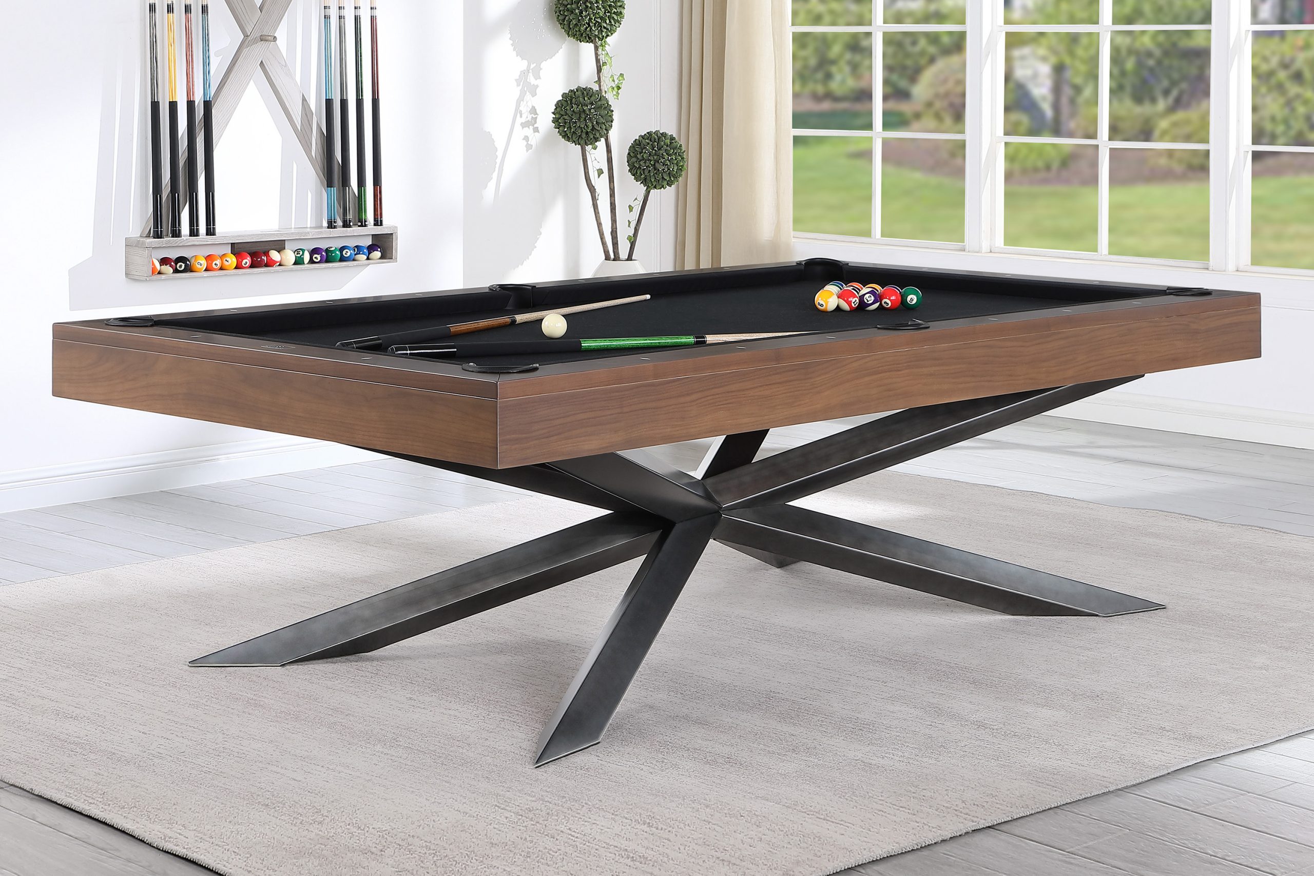 Includes: 57″ 2-Piece Wood Cues (4), Table Brush, Wood Triangle, Wood 9-Ball Triangle, Bridge Cue with Bridge Head, 6-Cue Rack, Billiard Ball Set, Table Cover, and Chalk.